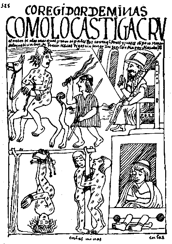 Abb.: Corregidor de minas / como lo castiga cruelmente a los caciques principales, corregidores y jueces con poco temor de la justicia, con diferentes castigos, sin tener misericordia por Dios a los pobres / en las [Guaman Poma de Ayala, 1615, Abb. 525]"Los mineros