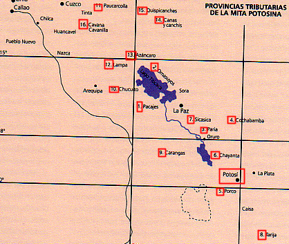 Abb.: Zur Entsendung von Zwangsarbeitern nach Potosí (mita) verpflichtete Provinzen[Bildquelle: Arzans de Orsúa ya Vela <1676 - 1736>: El mundo desde Potosí : selección. -- [La Paz] : Banco Santa Cruz, [2001]. -- S. 38]