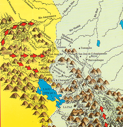 Abb.: Zugangswege nach Mojos in der frühen Kolonialzeit[Quelle der Abb.: Pinto Parada, Rodolfo <1940 - >: Narasaquije : 20 lecciones de historia del Beni. -- Trinidad, 2000. -- Depósito legal 8-1-314-00. -- S. 14]