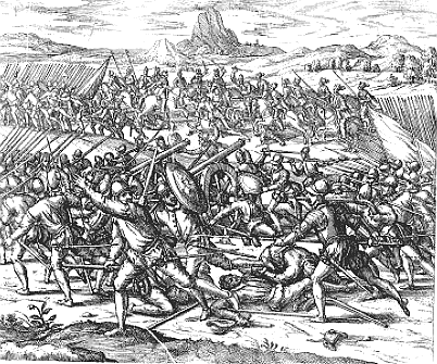 Abb.: Schlacht zwischen den Heeren Pizarros und Almagros (Stich von Johannes Stradanus, 1594-1619)