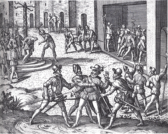 »Imgleichen bezeuge und beteure ich hiermit, dass die Spanier, sobald sie in dies Land kamen, und ohne dass die Indianer die mindeste Veranlassung dazu gaben, sich vom obersten Caziquen Atabaliba mehr als zwei Millionen Goldes bezahlen ließen. Und nachdem er ihnen das Land, welches er beherrschte, ohne den mindesten Anstand unterworfen hatte, verbrannten sie besagten Atabaliba, den Herrn des ganzen Reichs, auf der Stelle. Nach ihm verbrannten sie seinen obersten Heerführer, Cochilimaca, lebendig, der doch, nebst ändern Vornehmen, zum Gouverneur in Frieden kam. Auf gleiche Art verbrannten sie einige Tage nachher einen ändern Caziquen, welcher Chamba hieß, und die Provinz Quito beherrschte. Er hatte nicht das geringste verbrochen, und sie wussten selbst nicht, warum sie ihn töteten. «