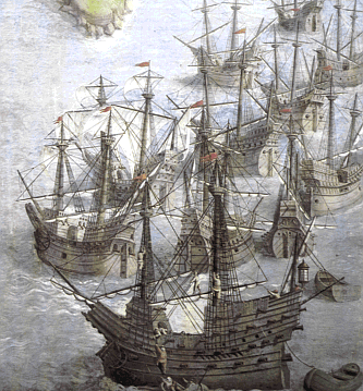 Abb.: Spanische Galeonen, 1583[Bildquelle: Die Armada / von Bryce Walker und der Redaktion der Time-Life Bücher. -- Amsterdam : Time-Life, ©1982. -- (Die Seefahrer). -- ISBN 906-182-418-4. -- S. 25]
