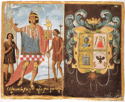Abb.: Wappen, das Karl V. den Inkas Gonzalo Uchu Hualpa und Felipe Tupa Inga Yupanqui als rechtmäßigen Adeligen verliehen hat [Archivo de Indias, Sevilla][Bildquelle: Discovering the Americas : the Archive of the Indies / by Pedro González García ... -- New York [u.a.] : Vendome, ©1997. -- ISBN 0-86565-991-5. -- S. 68]