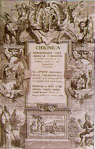 Calancha, Antonio de la <1584, La Plata - 1654, Lima>: Coronica moralizada del Orden de San Augustín en el Perú con sucesos exenplares vistos en esta monarquia ... / Compuesta por el muvy reverendo padre maestro fray Antonio de la Calancha ... -- Barcelona : P. Lacavalleria, 1639-53. -- 2 Bde. : Ill. -- Titel von Bd. 2: Coronica moralizada de la provincia del Perv del Orden de San Avgvstin nvestro padre ... Lima, I. Lopez de Herrera, impressor de libros. -- Mitverfasser von Bd. 2: Bernardo de Torres.