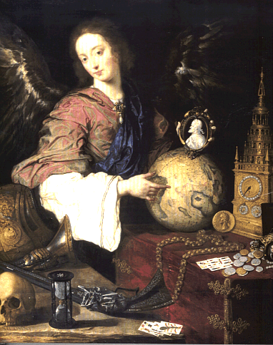 "In dieser wohlüberlegten Komposition hat der Künstler die Symbole der Macht -- Reichtum, Rüstung, Weltkugel mit den Territorien des spanischen Weltreichs -- zusammengestellt; die Herrscher sind in Medaillons zu erkennen. Er unterstreicht die Flüchtigkeit dieser weltlichen Dinge, den raschen Fortgang der Zeit (Uhr und Sanduhr), den Zufall (Spielkarten) und erinnert an den Tod, dessen endgültiger Sieg durch die Totcnschädcl symbolisiert ist. Die Entstehungszeit dieses Bildes entspricht recht genau dem politischen Niedergang Spaniens, der Ende der dreißiger Jahre des 17. Jahrhunderts nicht mehr aufzuhalten war." [Benassar, Bartolomé ; Vincent, Bernard: Spanien : 16. und 17. Jahrhundert. -- Stuttgart : Klett-Cotta, ©1999. -- (Das goldene Zeitalter). -- ISBN 360894186X. -- Originaltitel: Le temps de l'Espagne. XVIe - XVIIe siècles (1999). -- S. 136. -- {Wenn Sie HIER klicken, können Sie dieses Buch bei amazon.de bestellen}]