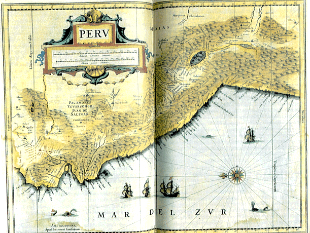 Abb.: Perú-Karte aus dem Atlas von MercatorGerardus Mercator (d.h. Gerhard Kremer) hat 1569 die später nach ihm benannte Mercator-Projektion entwickelt. Dabei wird der Erdglobus auf einen mit der Erdachse parallelen Zylinder projeziert. Dies fürhrt zwar zu Flächenverzerrungen, ist aber winkeltreu. Dies ist für die Seefahrt sehr hilfreich, da die Winkel, die man auf dem Wasser einschlägt mit den Winkeln auf der Karte übereinstimmen.
