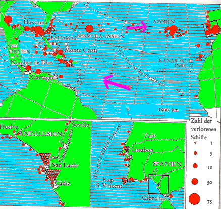 Verlorengegangene Schiffe aus der Amerika-Route. Die meisten Schiffe fielen Naturgewalten zum Opfer, ein kleinerer Teil Seeräubern und Kaperern.