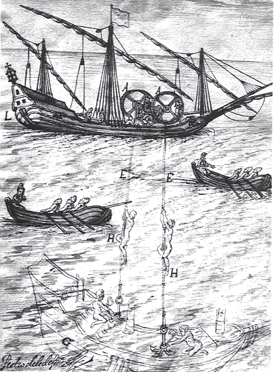 Abb.: Taucher bergen die Schätze eines gesunkenen spanischen Schiffes der Silberflotte, 1626[Bildquelle: Ships and shipwrecks of the Americas : a history based on underwater archaeology / edited by George F. Bass. -- 1. paperback ed. --New York, N.Y. : Thames and Hudson, 1996. -- 272 S. : Ill. -- ISBN: 050027892X. -- S. 95. -- {Wenn Sie HIER klicken, können Sie dieses Buch bei amazon.de bestellen}]
