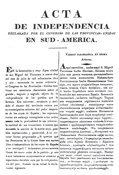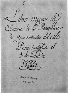 La Representación soberana de las provincias del Alto Perú, profundamente penetrada del grandor e inmenso peso de su responsabilidad para con el cielo, y con la tierra, en el acto de pronunciar la suerte futura de sus comitentes, despojándose en las aras de la justicia, de todo espíritu de parcialidad, interés, y miras privadas; habiendo implorado llena de sumisión y respetuoso ardor, la paternal asistencia del Hacedor Santo del Orbe, y tranquila en lo íntimo de su conciencia por la buena fe, detención, justicia, moderación, y profundas meditaciones que presiden a la presente resolución; declara solemnemente a nombre y de absoluto poder de sus dignos Representados: Que ha llegado el venturoso día en que las inalterables, y ardientes votos del Alto Perú, por emanciparse del poder injusto, opresor y miserable del rey Fernando Séptimo, mil veces corroborados por la sangre de sus hijos consten con la solemnidad, y autenticidad que al presente; y que cese para con esta privilegiada región, la condición degradante de Colonia de la España, junto con toda dependencia, tanto de ella como de su actual y posteriores Monarcas; que en consecuencia, y siendo al mismo tiempo interesante a su dicha, no asociarse a ninguna de las Repúblicas vecinas, se erige en un Estado Soberano e Independiente de todas las naciones, tanto del viejo como del nuevo mundo, y los Departamentos del Alto Perú firmes y unánimes en esta tan justa y magnánima resolución, protestan a la faz de la tierra entera, que su voluntad irrevocable es gobernarse por sí mismos, y ser regidos por la Constitución, leyes y autoridades que ellos propios se diesen, y creyesen más conducentes a su futura felicidad en clase de nación, y el sostén inalterable de su santa religión católica y de los sacrosantos derechos de honor, vida, libertad, igualdad, propiedad y seguridad. Y para la invariabilidad y firmeza de esta resolución, se ligan, vinculan y comprometen por medio de esta Representación Soberana, a sostenerla tan firme, constante y heroicamente, que en caso necesario sean consagrados con placer a su cumplimiento, defensa e inalterabilidad, la vida misma con los haberes, y cuanto hay caro para los hombres.