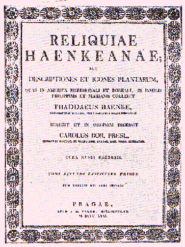Reliquiae Haenkeanae, seu Descriptiones et icones plantarum, quas in America meridionali et boreali, in insulis Philippinis et Marianis collegit Thaddaeus Haenke / Redegit et in ordinem digessit Carolus Bor. Presl. -- Prag : Calve, 1825ff. -- 2 Bde. in 3