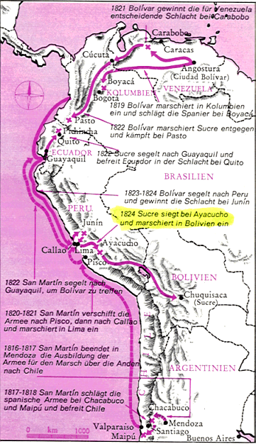 Antonio José Sucres Siegesbericht an Bolivar nach der Schlacht von Ayacucho "Der Krieg ist beendet und die Freiheit Perus errungen. Ich bin überaus glücklich, Ihren Auftrag erfüllt zu haben. Der Befehl zur Eröffnung einer Schlacht, den mir Medina überbrachte, hat mich von großen Schwierigkeiten befreit, denn auf dem Rückzug aus der Umgebung von Cuzco bis Huamanga, immer in Tuchfühlung mit dem Feind und gezwungen, jeden Tag einen Kampf zu liefern, habe ich sehr gelitten. Ich musste viel überlegen, scharf denken und kalkulieren, und dies alles hat mich sehr mitgenommen.