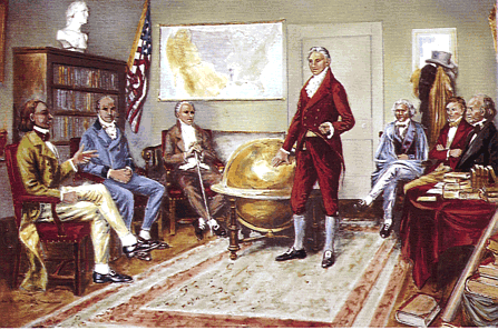 Abb.: Clyde O. de Land: Präsident Monroe erläutert seinen Beratern die Monroe-Doktrin, 1912