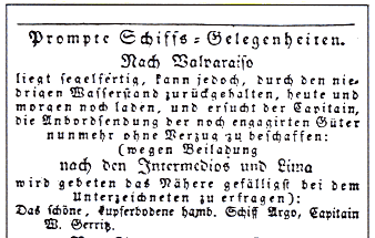 Zeitungsannonce der Firma Knöhr & Burchard in Hamburg über Verschiffungsgelegenheit an südamerikanische Westküste (Ausschnitt):