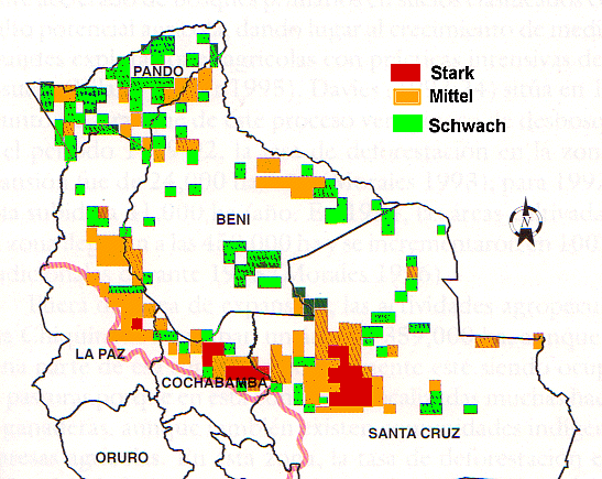 Abb.: Entwaldung in bolivianisch Amazonien 1985 - 1990[Vorlage der Abb.: Pacheco Ballanza, Pablo: Estilos de desarollo, deforestación y degradación de los bosques en las tierras bajas de Bolivia. -- La Paz : CIFOR [u.a.], 1998. -- Depósito legal 4-1-490-98. -- Mapa 3]