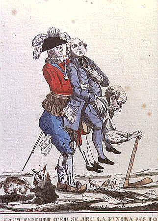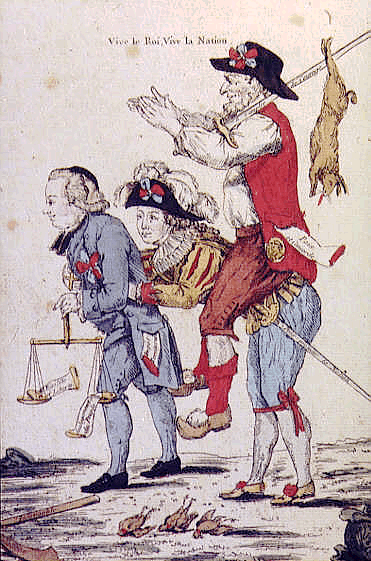 Abb.: Vor der Französischen Revolution: Der Dritte Stand trägt die Laste der anderen zwei Stände. Er stützt sich dabei auf seine Hacke (Aufschrift: "Von Tränen benetzt"), aus seiner Tasche hängen Zettel mit "Steuern", "Zehnt", "Fron- und Militärdienst", seine Saat wird von gefräßigen Rebhühnern und Hasen aufgefressen (adliges Jagdprivileg). Der Abbé ist geprägt von Prunksucht, der Degen des Herzogs ist "von Blut gerötet". |