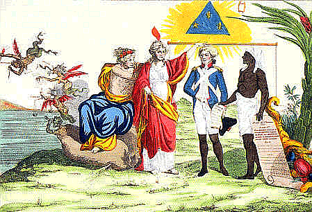 Abb.: Nach der Französischen Revolution: Der Bauer reitet nunmehr auf seinen ehemaligen Unterdrückern, er hat die Hacke weggeworfen, die Tiere, die früher Saat und Ernte vernichtet haben, liegen gerupft am Boden. Er selbst folgt dem Ziel von "Frieden und Eintracht" und damit dem Vorbild König Heinrichs IV. (Medaillon an der Jacke). Die früher Privilegierten tragen die Waage der Gerechtigkeit mit "Gleichheit, Freiheit und Entlastung des Volkes" und sind zu einer allgemeinen "Grundsteuer" verpflichtet. Alle drei tragen die Kokarde, die die patriotische Eintracht versinnbildlicht. |