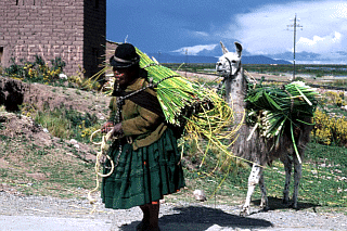 Abb.: Riedgrastransport mit Lama, Puno, Peru (©Corbis)