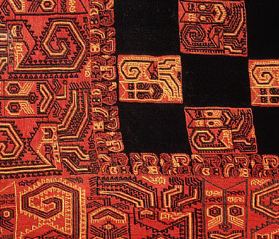 Abb.: Paracas-Lamawollstoff (©Corbis)Oft schließen sich den weidenden Haustieren auf den Berghängen auch Trupps ihrer wilden Verwandten an. Vikunjas gesellen sich gleichfalls gern zu zahmen Lama- und Alpakaherden. Aus dieser Vergesellschaftung kann man also keine Schlüsse über die Verwandtschaft der einzelnen Formen zueinander ziehen.