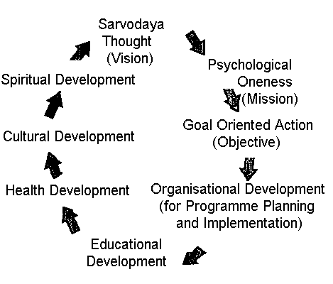 'Gramodaya or village awakening go through several identifiable phases one after the other and some together with others. Very broadly these stages are (i) a psychological infra-structural stage where the members of the community start thinking together; (ü) a social infrastructural stage where they start getting organized together; (iii) a physical infra-structural stage where they start building on their own effort the material foundation for their new life; and (iv) a technological infra-structural stage where they upgrade their technological know-how without endangering their psychosocial and economic balance. All these stages have to be passed through within a strong spiritual and cultural framework.' [Ariayaratna]