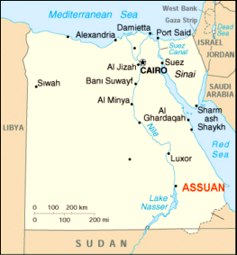 "Nasriya ist mit 50.000 Einwohnern mehr als ein Viertel der Gesamtbevölkerung von Assuan -- die größte "Randsiedlung" dieser Stadt. Die meisten Einwohner von Nasriya zählen mit einem monatlichen Einkommen zwischen 25 und 75 DM tendenziell zu der ärmeren Bevölkerung Ägyptens. Die Stadt entstand in den 60er Jahren, als die Regierung auf der Suche nach Arbeitskräften für den Bau des Assuan-Staudamms viele Menschen vom Lande -- manchmal gleich ganze Dörfer -- nach Assuan umsiedelte. Nasriya ist also keine illegale Siedlung; das Land gehört der Stadt, und die Siedler zahlen eine jährliche Pacht.