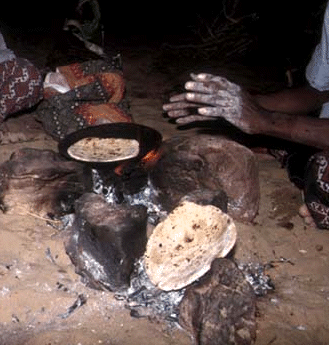 In dörflichen Haushalten setzt die Hausfrau alle Speisen auf ein Metalltablett. Fladenbrotstücke dienen als Löffelersatz.