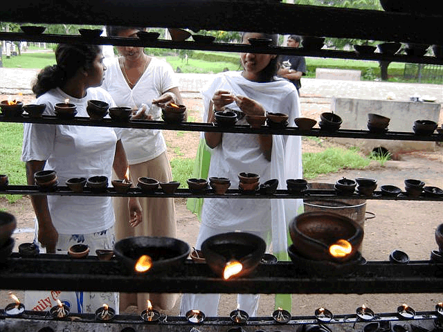 [Bildquelle: HumanityAshore.org. -- http://www.flickr.com/photos/humanityashore/72541576/. -- Creative Commons Lizenz. -- Zugriff am 2006-05-29]Another popular ritual connected with the Bodhi-tree is the lighting of coconut-oil lamps as an offering (pahan-puja), especially to avert the evil influence of inauspicious planetary conjunctions. When a person passes through a troublesome period in life he may get his horoscope read by an astrologer in order to discover whether he is under bad planetary influences. If so, one of the recommendations would invariably be a bodhi-puja, one important item of which would be the lighting of a specific number of coconut-oil lamps around a Bodhi-tree in a temple.