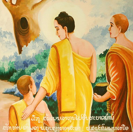 Die Mönchsgemeinde stimmte zu. Dann ging er mit seinen Bitten immer mehr hinunter bis er für eine Woche bat. Für eine Woche erhielt er die Zustimmung der Hälfte der Mönche. Als er diese gewonnen hatte, war er froh und ließ an achtzehn1 Stellen um den Platz des Stūpa herum Pavillions erbauen. Dann ließ er dort während einer Woche ein großes Almosenfest für die Mönchsgemeinde abhalten. Dann entließ er die Mönchsgemeinde.