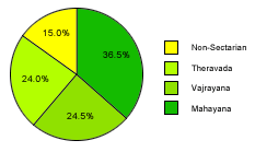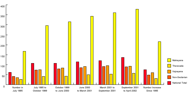 Mahyana Theravada Vajrayana Non-Sectarian Total July 1995 62 42 36 27 167 July 1995- Oct 1999 107 75 76 42 296 Oct 1999-June 2000 108 80 84 43 315 June 2000-March 2001115