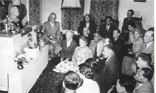 Abb.: Treffen der Buddhist Society of NSW (ganz links: Leo Berkeley und Mary Byles"The year prior to Hawke's stay, a wealthy Sydney businessman named Leo Berkeley had been holding similar discussions with the Venerable Narada Thera at the Vajirarama Vihara in Colombo. Born in Holland in 1902, Leo Berkeley came to Australia in 1947 after more than twenty years running an antiquarian bookstore in London. In early 1951, while on board a ship back to England, he met Sir Lalita Rajapakse, the then minister of Justice in the Sri Lankan government, who introduced him to Buddhist thought. He was particularly impressed by the notion that in Buddhism you can control your own destiny, and when the ship stopped off at Colombo Rajapakse introduced him to Narada, who gave him some literature and invited him to visit again on his return to Australia. This he did two months later, growing enthusiastic at Narada's suggestion that he establish a Buddhist society in Sydney. Soon after his return, in mid-1951, he read an article about Marie Byles in the Sydney Morning Herald and contacted her about forming a society. At first she was reluctant, believing that Australia was not yet ready for Buddhism, but before too long gave way in the face of his not inconsiderable charm. The following Saturday Leo Berkeley placed an advertisement in the newspapers and within two weeks had ten members meeting at his home in East Roseville. Organised Buddhism on an ongoing basis in Australia had been born.
