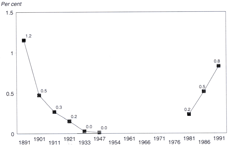 Abb.: Buddhisten in Prozenten der australischen Bevölkerung 1891 bis 1991