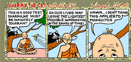 Lourie, David: Dharma the cat : philosophy with fur / cartoons by David Lourie and Ted Blackall. -- East Roseville, N.S.W. : Simon & Schuster, 2000. -- 80 S. : Ill. ; 11 cm. -- ISBN 073181035X.Webpräsenz: http://www.dharmathecat.com/. -- Zugriff am 2005-06-09. -- Mit vielen Cartoons!