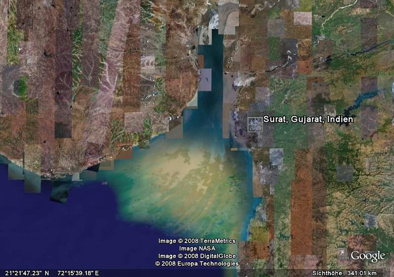 (©Google Earth. -- Zugriff am 2008-05-27]Surat [સુરત], situated on the left bank of that river, about 14 miles from its mouth, was now one of the chief ports of India, and the centre of trade with the Red Sea. The harbour of its more northerly rival, Cambay [Khmbhāṭ], was fast silting up, and sea-going ships of any size could no longer lade there, but had to embark their goods from lighters at Gogha, on the opposite side of the Gulf [S. 63] of Cambay. Surat possessed the further advantage that vessels frequenting it were spared the voyage up that dangerous gulf, which was full of sandbanks ; but, on the other hand, the only roadstead available for ships of any size was the exposed anchorage outside the bar at the mouth of the river, and this was safe merely during the period of fair weather. For customs purposes it was under the control of a certain Mukarrab Khān, who was also in charge of the port of Cambay—the customs of Gujarāt going thus directly into the royal treasury. This individual was a great favourite with the reigning Emperor Jahangīr (the son of Akbar, whom he had succeeded in 1605), having won his regard by his skill in surgery and by his usefulness in the field sports to which that monarch was so much addicted. This esteem Mukarrab Khān took care to maintain by seeking out and presenting curiosities of all sorts, and it was doubtless for such purposes that he had obtained charge of the Gujarāt ports, where the trade carried on with the Portuguese gave him many opportunities of acquiring rarities of every description. In these circumstances the arrival of a ship belonging to an unfamiliar European nation was naturally of great interest to him, and he quickly dispatched his brother to Surat to examine the cargo, himself following a little later. In the meantime Hawkins prepared for the further voyage of the Hector by buying goods suitable for Bantam, much to the annoyance of the Surat merchants trading to those parts, who feared the competition of the new-comers. Hawkins himself had decided to remain behind and proceed to Agra with King James's letters ; so he handed over the command of the ship to Anthony Marlow (one of the merchants who had come with him) and sent him down the river with the goods in two boats, manned by about thirty men. On their way they were attacked by some Portuguese frigates1 and many of their number, with all the goods, were captured. Hawkins at once demanded their restitution, but was answered only with insults and a declaration that the Indian seas belonged exclusively to Portugal. The captives were sent to Goa and thence to Lisbon ; while the merchandise was confiscated. On October 5 the Hector departed for Bantam, leaving Hawkins with only William Finch and two English servants. Two days earlier Mukarrab Khān had reached Surat. He was at first extremely gracious to Hawkins ; but once he had got into his possession all the goods he specially coveted, his behaviour changed. He dared not prevent the Englishman from going to Agra, since the latter claimed (without any authorization) to be an ambassador and undoubtedly had [S. 64] royal letters to deliver to the Emperor ; but he refused to pay for the goods he had bought (except at his own price) and, according to Hawkins, at the instigation of a Jesuit he plotted to have him murdered on the way. All the time of Hawkins's stay in Surat he was troubled by the threats and intrigues of the Portuguese, who, as he asserts, made several attempts to assassinate him.