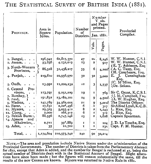 [Including the less exact work thus done for the Native States, the results of the Statistical Survey of British and Feudatory India, now (1886) make 128 printed volumes, aggregating 60,000 pages.]