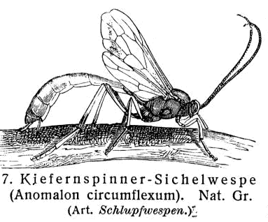 Fig. 7Die Kiefernspinnersichelwespe (Anomalon circumflexum L., s. Tafel »Hautflügler I«, Fig. 7), 2-3 cm lang, mit gelbrotem, schwarz gespitztem Hinterleib, rötlichgelben Beinen mit hellern Schenkelringen, schwarzen Hüften, an den hintern mit schwarzen Schenkelspitzen und Schienen, braunroten Fühlern, rotgelb geflecktem Kopf und gelbem Schild, legt ihre Eier in Kiefernspinnerraupen, in denen sich die Larven entwickeln und verpuppen, wenn sich die Raupe verpuppt, so dass sich die Wespe erst aus der abgestorbenen Puppe des Wirtes herausfrisst.