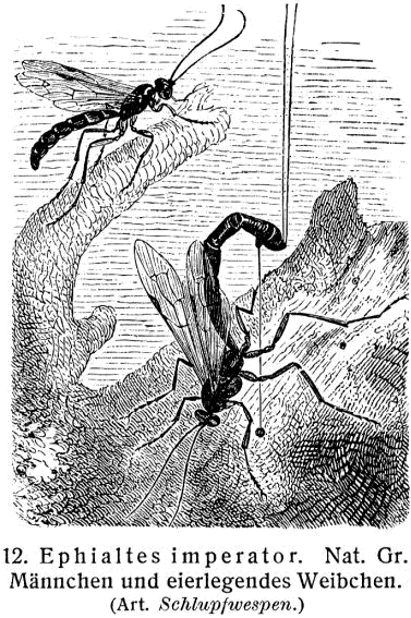 Fig. 12Die Ephialtes-Arten (s. Tafel »Hautflügler I«, Fig. 12) dagegen, die ebenfalls ihre Eier in Larven legen, die im Holz wohnen, schieben den Legestachel durch ein Bohrloch ein.