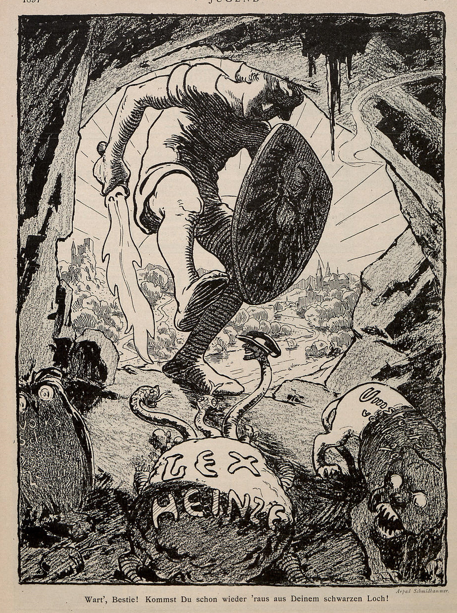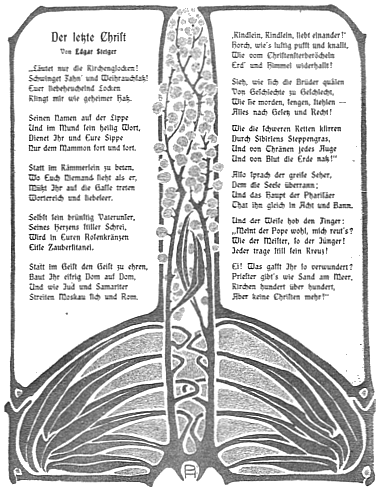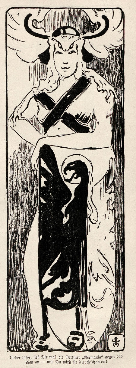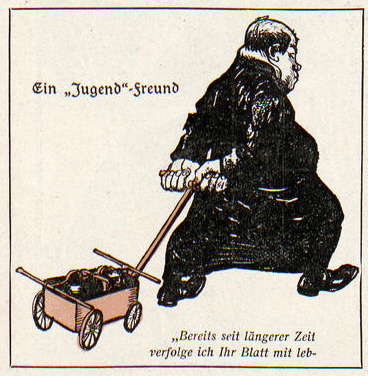 [Bildquelle: Jugend : 1896 - 1940, Zeitschrift einer Epoche ; Aspekte einer Wochenschrift "Für Kunst und Leben" / Heinz Spielmann. -- Dortmund : Harenberg, 1988. -- 224 S. : überwiegend Ill. ; 18 cm. -- (Die bibliophilen Taschenbücher ; Nr. 545). -- ISBN 3-88379-545-3. -- S. 76f.]