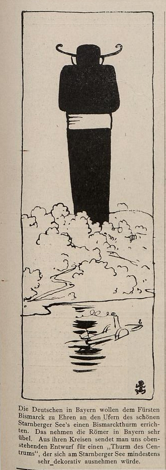 Die Deutschen in Bayern wollen dem Fürsten Bismarck zu Ehren an den Ufern der schönen Starnberger Sees einen Bismarckturm, errichten. Das nehmen die Römer in Bayern sehr übel. Aus ihren Kreisen sendet man uns obenstehenden Entwurf für einen "Turm des Zentrums", der sich am Starnberger See mindestens sehr dekorativ ausnehmen würde.