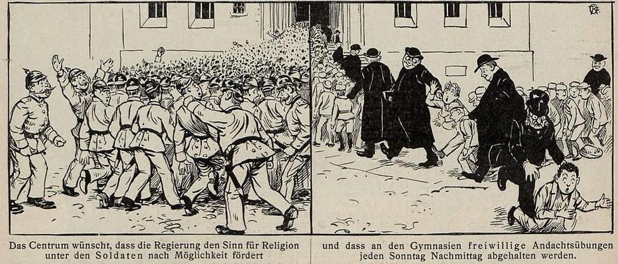 Das Zentrum wünscht, dass die Regierung den Sinn für Religion unter den Soldaten nach Möglichkeit fördert - und dass an den Gymnasien freiwillige Andachtsübungen jeden Sonntag Nachmittag abgehalten werden.