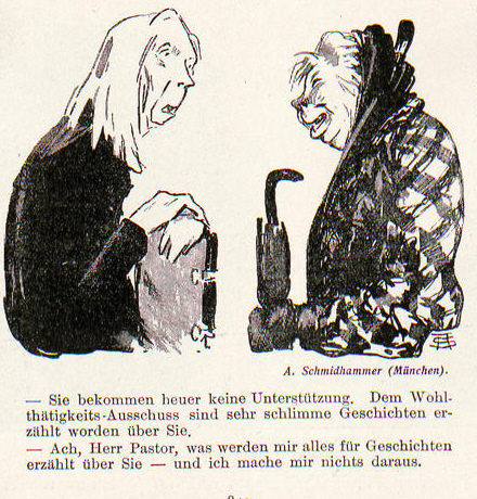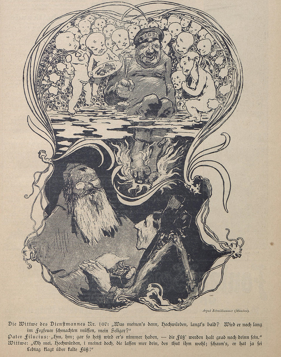 Die Witwe des Dienstmannes Nr. 107: "Was meinen's denn, Hochwürden, langt's bald? Wird er noch lang im Fegfeuer schmachten müssen, mein Seliger?"