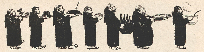 Jetzt sind wir ohne Dach und Brot und Champagner und Maitressen und Equipagen und Lakaien und was sonst gehört zu Gelübde von Armut und Keuschheit und gottgefällige Leben. Haben uns auch genommen zwanzig Zellen voll Apparate für sekrete Vergnüglichkeiten, wo doch die Mensch haben muss bissel Zerstreuung. Alles haben genommen und jagen uns aus Kloster salva venia nackt und bloß wie Herde Schweine. Gott wird schon strafen!
