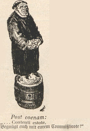 Erläuterung: Papst Pius X. gießt mit der Enzyklika Editae saepe (sog. Borromäus-Enzyklika) Jauche über die Gläubigen. In dieser Enzyklika greift der Papst die Reformation und die Reformatoren auf das Heftigste an: