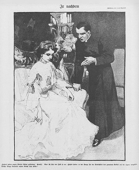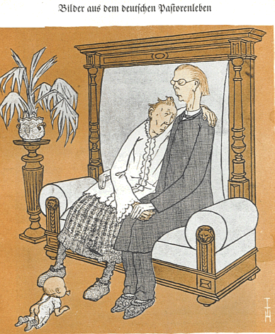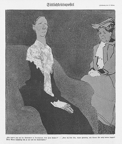 "Wie steht's jetzt mit der Sittlichkeit in Deutschland, liebe Frau Pastor?" — "Aber ich bitte Sie, bestes Fräulein, wie können Sie mich darum fragen? Mein Mann beschäftigt sich ja nur mit der Unsittlichkeit."