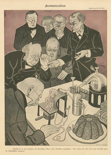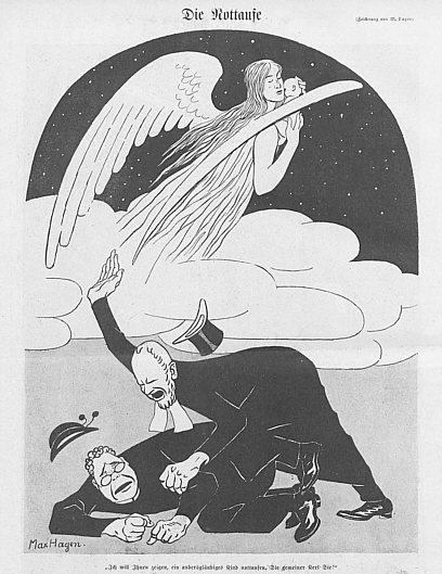 "Auf dem Magdeburger Sittlichkeitskongress hat sich herausgestellt, wie schwere Gefahren es mit sich bringen muss, wenn man die außerehelich geborenen den auf gesetzmäßigem Wege erzeugten Kindern gleich stellt. Fräulein Paula Müller1, die zuerst auf diese Gefahr aufmerksam gemacht hat, sei dieses Bild verehrungsvoll gewidmet."