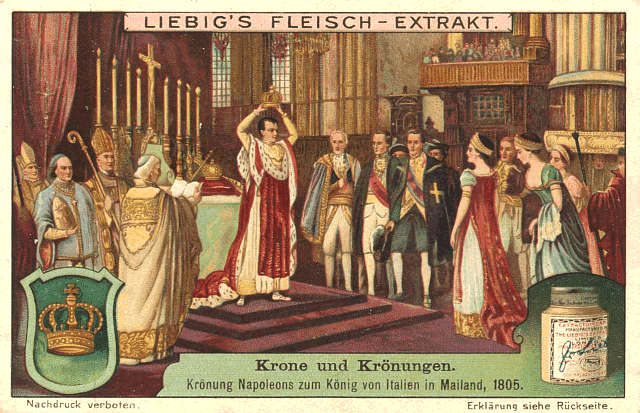 "Krönung, die feierliche Einsetzung eines Monarchen in die Regierung unter Zeremonien, deren wichtigste die öffentliche Aussetzung der Krone (s. d.) ist. Das Vorbild der meisten spätern Krönungsweisen gaben die Israeliten, deren Könige vor ihrer Thronbesteigung feierlich gesalbt wurden. Seit Joas ward es Sitte, dass der Hohepriester dem König die Krone (Tiara) aufsetzte, den Herrscherstab (Zepter) in die Hand gab und das Schwert umgürtete. Bei den griechischen und römischen Königen und später bei den römischen Kaisern war eine feierliche Krönung nicht gebräuchlich. Die byzantinischen Kaiser dagegen haben die feierliche Krönung eingeführt. Unter den germanischen Völkerschaften geschah die Einsetzung in die Herrschaft nicht durch die Krönung, sondern die Erhebung auf den Schild (elevatio) und das Umhertragen auf demselben (gyratio). Die christlichen Könige der Franken wurden in Reims vom Bischof mit Öl aus einem Fläschchen gesalbt, das zur Salbung des bekehrten Chlodwig durch eine Taube vom Himmel gebracht worden sein sollte (s. Ampulla). Die Könige andrer deutscher Stämme ahmten die fränkische und byzantinische Sitte nach. Die Könige der Langobarden ließen sich in Pavia, Mailand oder Monza krönen. 800 setzte Papst Leo III. in Rom Karl d. Gr. die kaiserliche Krone auf das Haupt. Die deutschen Könige wurden als solche in Aachen gekrönt (über die hierbei verwendeten Insignien vgl. Artikel »Deutsche Reichskleinodien«, mit der gleichnamigen Tafel, in Bd. 4), hatten aber seit Otto I. (962) auch ein Anrecht auf die römische Kaiserkrone, erhielten sie aber nur in Rom vom Papst aufgesetzt. Friedrich III. war der letzte deutsche König, der 1452 in Rom, Karl V. der letzte, der 1530 vom Papst und zwar in Bologna gekrönt wurde. Maximilian I. bereits hatte 1508 auch ohne Krönung den Titel »Erwählter römischer Kaiser« angenommen. Auch die Krönung mit der Eisernen Krone der Lombarden fiel weg (mit der burgundischen haben sich bloß fünf deutsche Könige, zuletzt Karl IV., krönen lassen), und die spätern deutschen Kaiser wurden daher nur einmal gekrönt. Ferdinand I. war der letzte, der 1531 in Aachen als deutscher König gekrönt wurde. Seitdem wurde Frankfurt a. M. der Krönungsort. Bei der Krönung des ersten Königs von Preußen 18. Jan. 1701 ist bemerkenswert, dass der König sich selbst und dann auch der Königin die Krone aufsetzte. Auch Napoleon I. setzte sich 2. Dez. 1804 in der Notre Dame-Kirche zu Paris die Kaiserkrone selbst auf und ließ den Papst nur die übrigen Zeremonien verrichten. In neuerer Zeit ist die Sitte der Krönung in Deutschland in Abnahme gekommen; an ihre Stelle trat die Huldigung (s. d.). Doch setzte sich wiederum König Wilhelm I. von Preußen, der einzige seit Friedrich I., dem ersten König, 18. Okt. 1861 in Königsberg die Krone selbst auf. Mit besondern Zeremonien ist die Krönung der Könige von Ungarn verbunden, denen sich noch Kaiser Franz Joseph von Österreich 8. Juni 1867 unterzog. Äußerst glanzvoll ist die Krönung der Kaiser von Russland in Moskau und sehr eigentümlich die Krönung der Könige von Norwegen in der alten Krönungsstadt Drontheim." [Quelle: Meyers großes Konversations-Lexikon. -- DVD-ROM-Ausg. Faksimile und Volltext der 6. Aufl. 1905-1909. -- Berlin : Directmedia Publ. --2003. -- 1 DVD-ROM. -- (Digitale Bibliothek ; 100). -- ISBN 3-89853-200-3. -- s.v.]