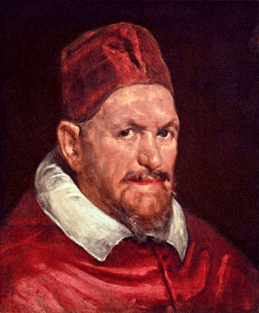 "Innozenz X., vorher Giovanni Battista Pamfili, geb. 7. Mai 1574 in Rom, gest. 5. Jan. 1655, ward unter Gregor XV. Nuntius in Neapel, von Urban VIII. dem Kardinal Franz Barberini nach Frankreich beigegeben und blieb hier bis zur Erlangung des Kardinalshutes als Nuntius und Patriarch von Antiochia. Trotz des Widerstrebens des französischen Hofes wurde er 15. Sept. 1644 zum Nachfolger Urbans VIII. erwählt. Er protestierte 1651 in der Bulle »Zelo domus Dei« gegen den Westfälischen Frieden und erließ 1653 die viel angefochtene Bulle »Cum occasione« gegen die »V propositiones« des Cornelis Jansen (s. Jansenismus). Während seines Pontifikats übte den größten Einfluss seine Schwägerin Olimpia Maidalchini (1594-1656) aus; sie beherrschte ihn und den Kirchenstaat und benutzte ihre Macht, um sich durch schamlose Mittel aller Art zu bereichern." [Quelle: Meyers großes Konversations-Lexikon. -- DVD-ROM-Ausg. Faksimile und Volltext der 6. Aufl. 1905-1909. -- Berlin : Directmedia Publ. --2003. -- 1 DVD-ROM. -- (Digitale Bibliothek ; 100). -- ISBN 3-89853-200-3. -- s.v.]