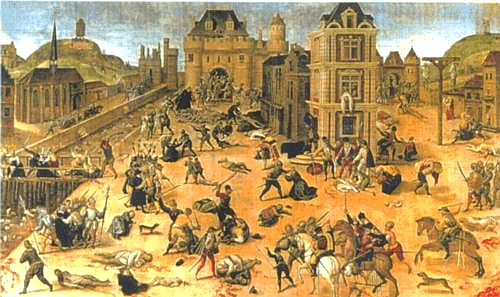 "Bartholomäusnacht oder Pariser Bluthochzeit, die Ermordung der Protestanten ( Hugenotten, s. d.) in Paris 24. Aug. 1572. Daß die Tat schon seit der Zusammenkunft mit Alba in Bayonne 1565 von Katharina und den katholischen Parteihäuptern geplant gewesen sei (so Bordier, La Saint- Barthélemy et la critique moderne, Genf 1879; Wuttke, mr Vorgeschichte der B., Leipz. 1879; Combes, L'entrevue de Bayonne et la question de la Saint-Barthélemy, Par. 1882), ist falsch. Katharina von Medici hatte im Einverständnis mit Heinrich von Anjou und den Guisen nur ihren Feind, den Admiral Coligny, der den König Karl IX. ganz für sich eingenommen hatte und ihn zum Kriege gegen Spanien drängte, beseitigen wollen. Als der Mordanschlag 22. Aug. 1572 mißglückte, beschloß sie aus Furcht vor der Rache der Hugenotten, die aus Anlaß der Hochzeit Heinrichs IV. mit Margarete von Valois in Paris zahlreich versammelt waren, deren Vernichtung und entriß 23. Aug. auch Karl IX. die Einwilligung. Der schändliche Frevel wurde in der Nacht vom 23. auf den 24. Aug. (B.) mit Hilfe der fanatisch-katholischen Bürger von Paris ausgeführt. Erst ward Coligny, dann alle protestantischen Edelleute, deren man habhaft werden konnte, ermordet, wenigstens 2000. Darauf fiel man auch in der Provinz über die Hugenotten her, deren in 4 Wochen 30,000 niedergemetzelt wurden. Karl IX. gab geheime Befehle, alle Ketzer als Feinde der Krone zu töten. Doch rafften sich die Protestanten zu tatkräftigem Widerstand auf. Weder Spanien noch die römische Kurie waren vorher von dem Mordplan unterrichtet worden, empfanden aber über dessen Ausführung lebhafte Genugtuung." [Quelle: Meyers großes Konversations-Lexikon. -- DVD-ROM-Ausg. Faksimile und Volltext der 6. Aufl. 1905-1909. -- Berlin : Directmedia Publ. --2003. -- 1 DVD-ROM. -- (Digitale Bibliothek ; 100). -- ISBN 3-89853-200-3. -- s.v.]