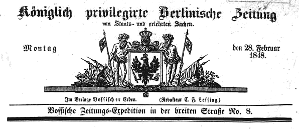 »Königlich privilegirte Berlinische Zeitung von Staats- und gelehrten Sachen. Im Verlage Vossischer Erben«, so heißt es am Kopfe des Blattes. Gleich darunter folgt dann unser preußisches Wappen, der Adler mit der Krone, gehalten von zwei wilden Männern, ähnlich denen, die man auch auf Wirtshausschildern sieht, namentlich in Krefeld bei Hornemann, dem ewigen Jüngling, der das bekannte, außerordentlich gute Diner gibt, zu 20 Silbergroschen preußisch, ohne Wein, um 1/2 2 Uhr mittags.