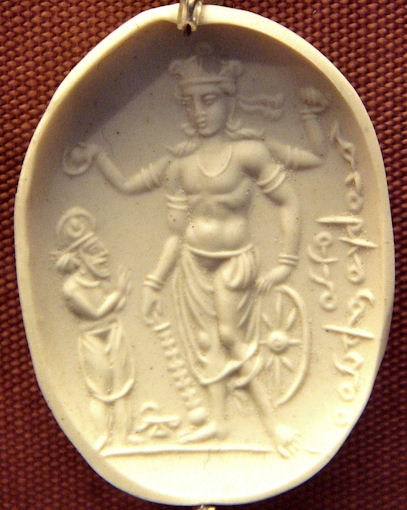 "A 4th-6th century CE Sardonyx seal representing Vishnu with a worshipper. The inscription in cursive Bactrian reads: "Mihira, Vishnu and Shiva".