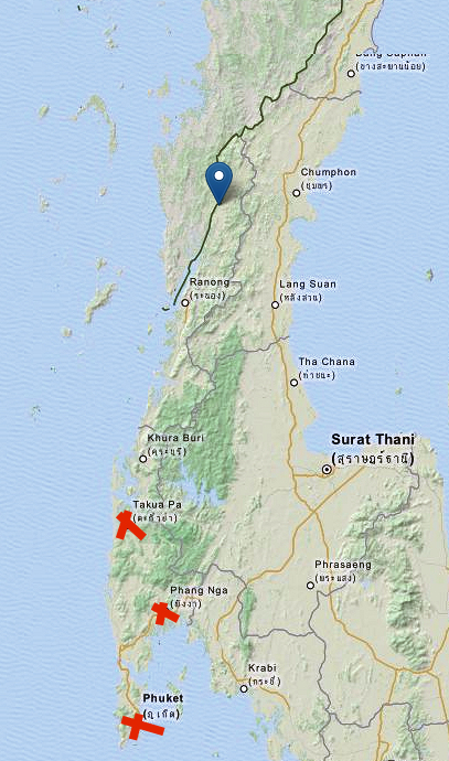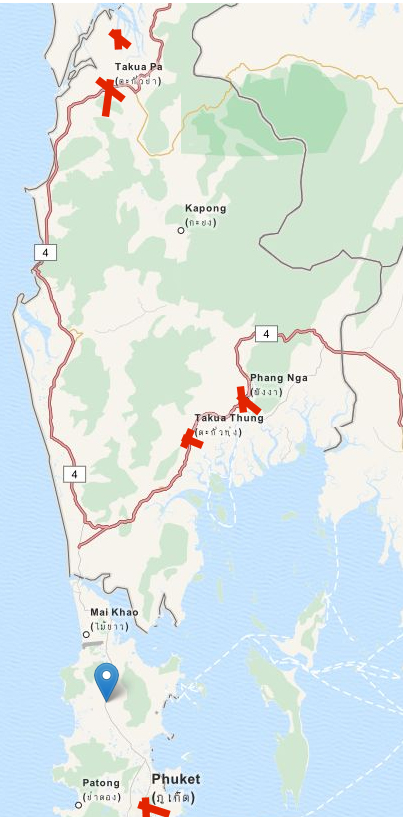 Abb.: Lage von (von N nach S): Khurot (คุรอด), Takua Pa (ตะกั่วป่า), Phang Nga (พังงา), Takua Thung (ตะกั่วทุ่ง), Thalang (ถลาง), Phuket (ภูเก็ต)