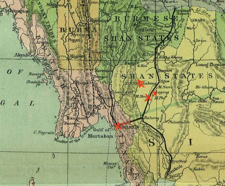 Abb.: Lage von Moulmein (မော်လမြိုင်မြို့), Hot (ฮอด), Lamphun (ลำพูน), Chiang Mai (เชียงใหม่), Lampang (ลำปาง)